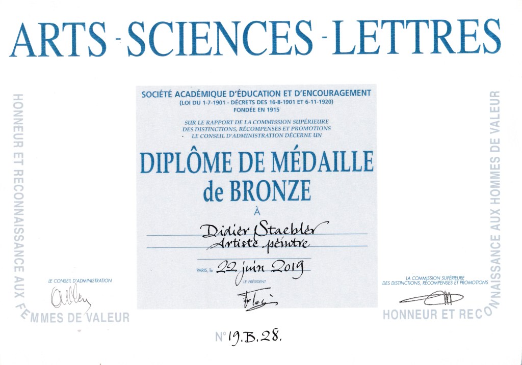 2019 Médaille de bronze remise par l’ Académie Arts-Sciences-Lettres